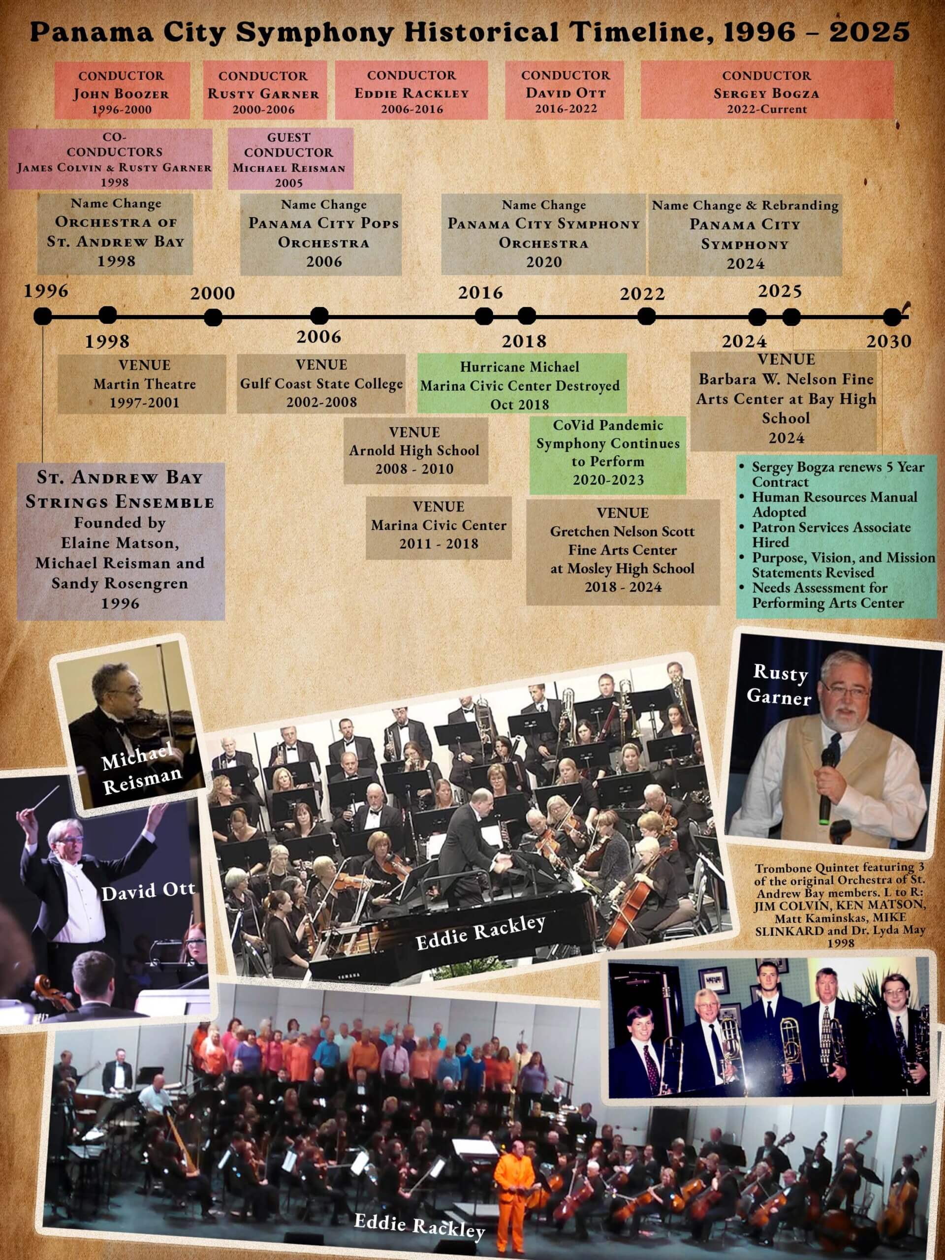 The Panama City Symphony began in 1996 as the Orchestra of St. Andrew Bay, a small group of string players seeking opportunities to play and perform together. It was founded by Elaine Matson, Michael Reisman and Sandy Rosengren. Led by John Boozer, this ensemble soon grew into a complete orchestra, playing a wide variety of symphonic music and training talented musicians guided by experienced adults.