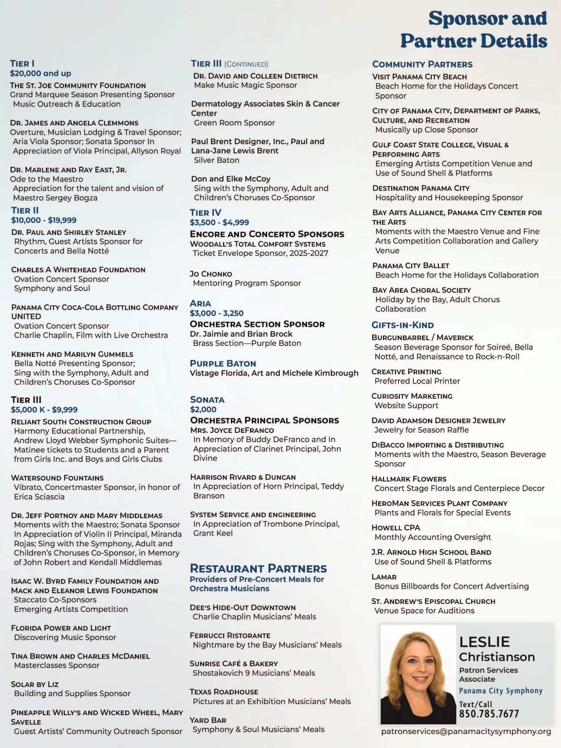 Support from these fine individuals and businesses allows the orchestra to continue its mission of providing a local orchestra for the enjoyment of our community. We would like to thank our sponsors who donate their time, resources, and financial support.